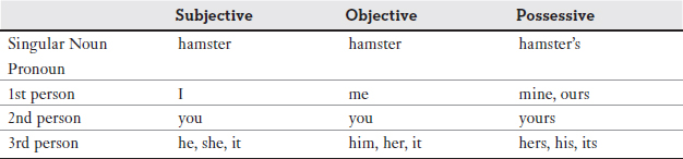 Possessive: Nouns and pronouns in the possessive case own something. To show ownership, you add –’s to the end of a noun or just an apostrophe to plural nouns ending in –s. Pronouns show ownership much differently, as explained next.