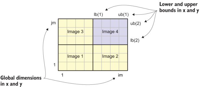 The second step is to determine the lower and upper bounds for the local image. Recall from the previous chapter that at the beginning of the tsunami program, we break the domain down into pieces and assign each piece to all available images. The local array extents will thus be different for each parallel image, like tiles on a chess board. These extents are calculated in the tile_indices function. We’ve already worked with the one-dimensional variant of this function, and here we apply it for a two-dimensional array. Its implementation is a bit more complex, and you can find it in appendix C.
