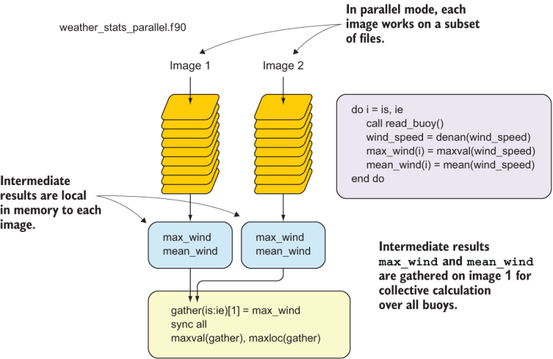 syncall. This will make all images wait for each other at this point. This ensures that image 1 doesn’t calculate and print the collective results before it receives data from all other images. - Use