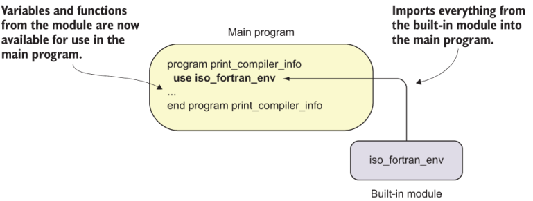 Once you have a compiled program executable, it’s not obvious how it was compiled. Specifically, what compiler was used, and were any compiler options used–for example, for debugging or optimization? Fortran’s iso_fortran_env module provides two functions that allow you to get this information at runtime: compiler_version and compiler_options. You get the idea what each of these functions does. Let’s write a program that imports these functions from the iso_fortran_env module, then call them to print this information to the screen. Figure 4.1 illustrates how accessing a module from a main program works, with the new syntax marked in bold.