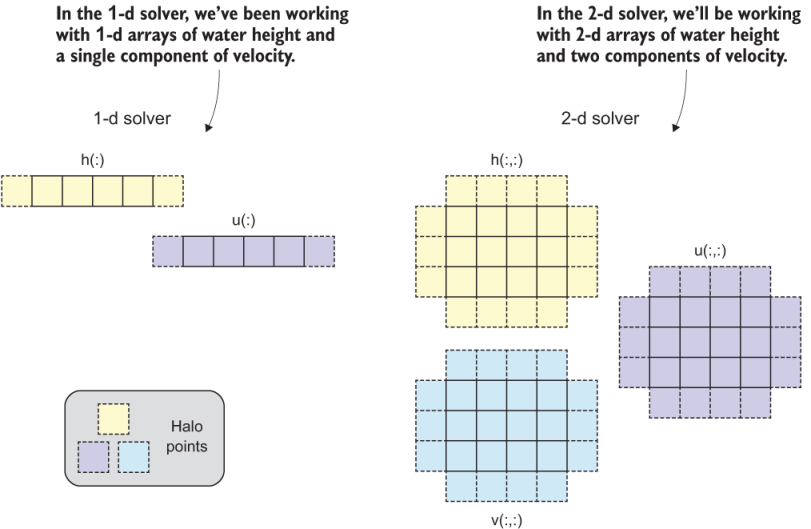 In other words, whereas so far we’ve been solving for a single velocity u(:) and water height h(:), now we’ll be solving for velocities in x and y axes (u(:,:) and v(:,:), respectively), and for water height h(:,:). This is illustrated in figure 8.6.