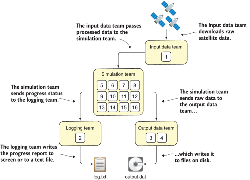 Fortran 2018 introduced teams to allow the programmer to assign different tasks to groups of images. For example, if you’re computing a weather simulation on 16 images, you could assign them different roles (figure 12.1).