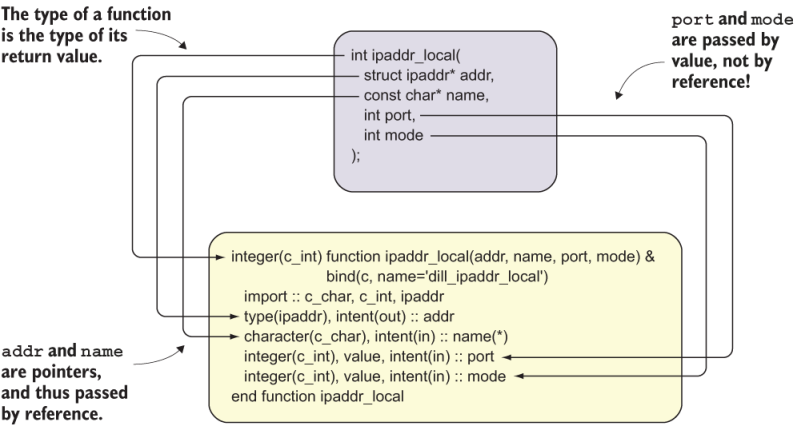 There’s a lot to unpack here, so I’ll go slowly. First, we use the function statement to define the function name and its arguments. This works the same way as with all Fortran functions we worked with before. One key difference is that here we add the bind attribute, like we did when defining the ipaddr derived type. Here, we also specify the name keyword argument in the parentheses, which is the name of the C function that we’ll bind our Fortran interface to. Notice that we’re binding to the name dill_ ipaddr_local, rather than just ipaddr_local. This is because libdill by default adds a prefix dill_ to all its functions to avoid name conflicts with any similar library that may export functions with the same name.