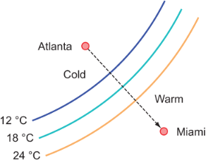 Figure 3.4 An illustration of a cold front moving from Atlanta toward Miami. Curved lines are contours of constant temperature. The dashed arrow shows the direction of front propagation. We used this example in the previous chapter to illustrate the concept of spatial gradients and advection.