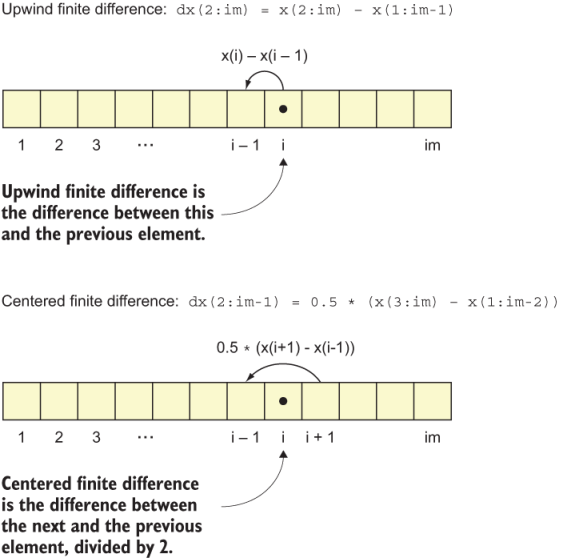 In contrast to the original finite difference, here we’re calculating the difference between the next and previous element and dividing by 2 to account for the fact that we’re calculating the difference over two increments. Figure 4.7 illustrates the difference in calculating these differences.