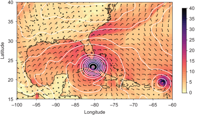 Figure 1.1 A forecast of Hurricane Irma on September 10, 2017, computed by an operational weather prediction model written in Fortran. Shading and barbs show surface wind speed in meters per second, and contours are isolines of sea-level pressure. A typical weather forecast is computed in parallel using hundreds or thousands of CPUs. (Data provided by the NOAA National Center for Environmental Prediction [NCEP])