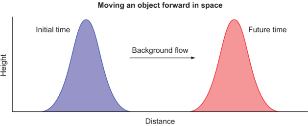 Figure 2.2 Advecting an object in space from left to right. The initial state is on the left. The object is advected from left to right by a background flow and after some time arrives at its final position on the right.